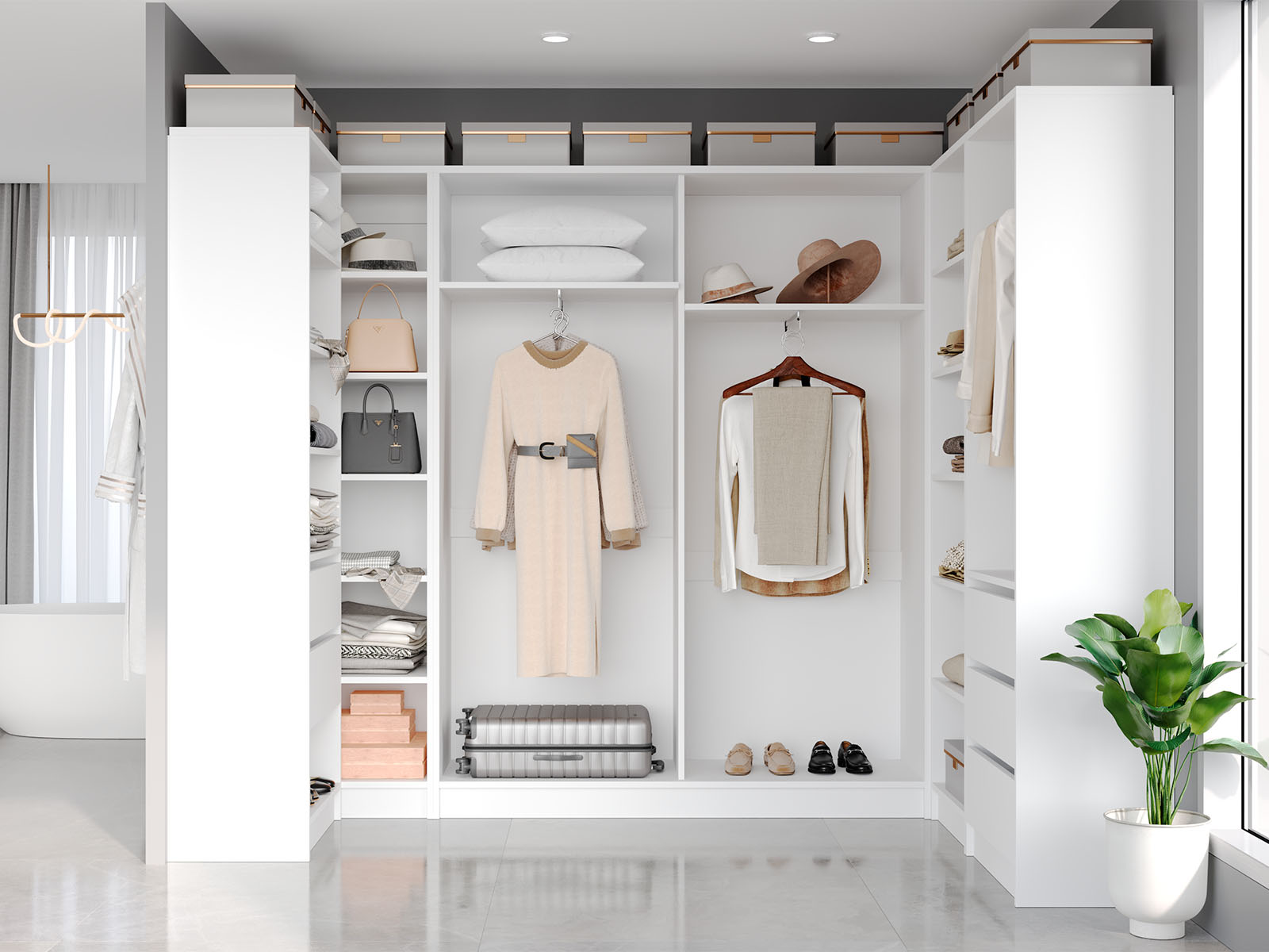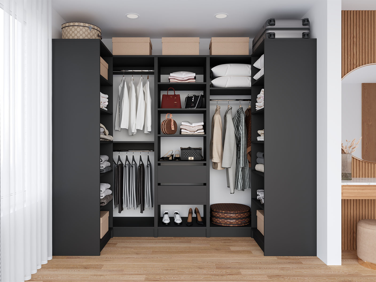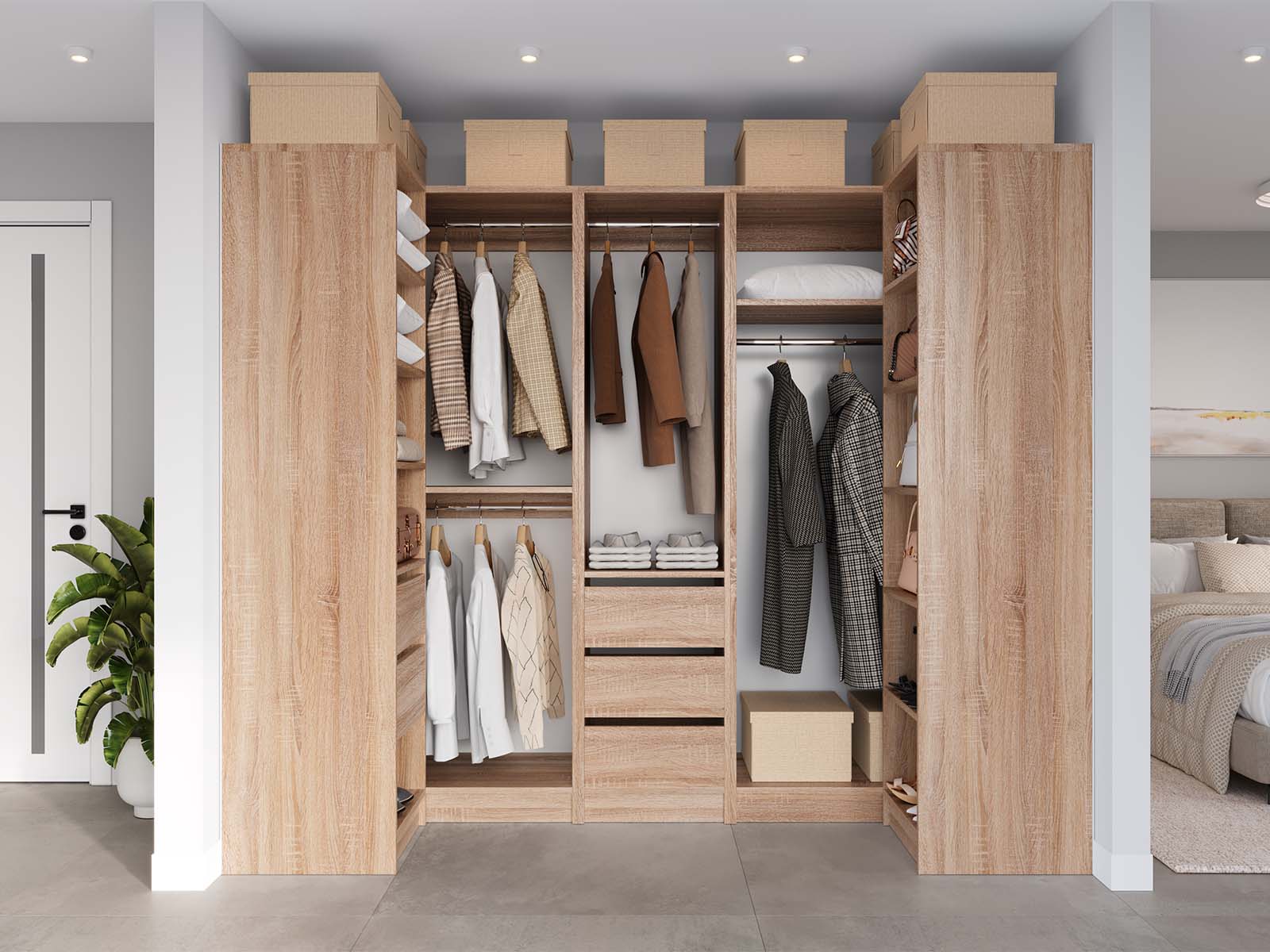 Гардеробна система  — це сучасне та функціональне рішення для організації зберігання речей у будь-якому приміщенні. Завдяки поєднанню відкритих полиць, містких ящиків і зручної штанги для вішаків, ця система дозволяє раціонально використовувати кожен сантиметр простору.