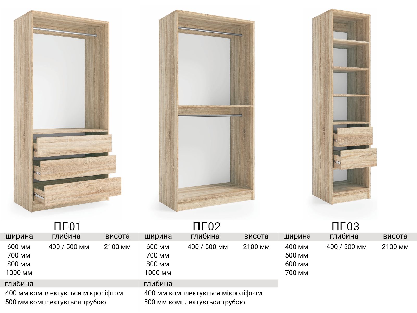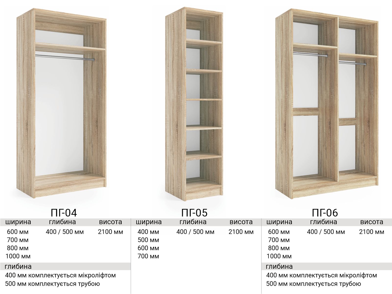 Всі секції доступні в різних розмірах по ширині (на фото показані можливі розміри)