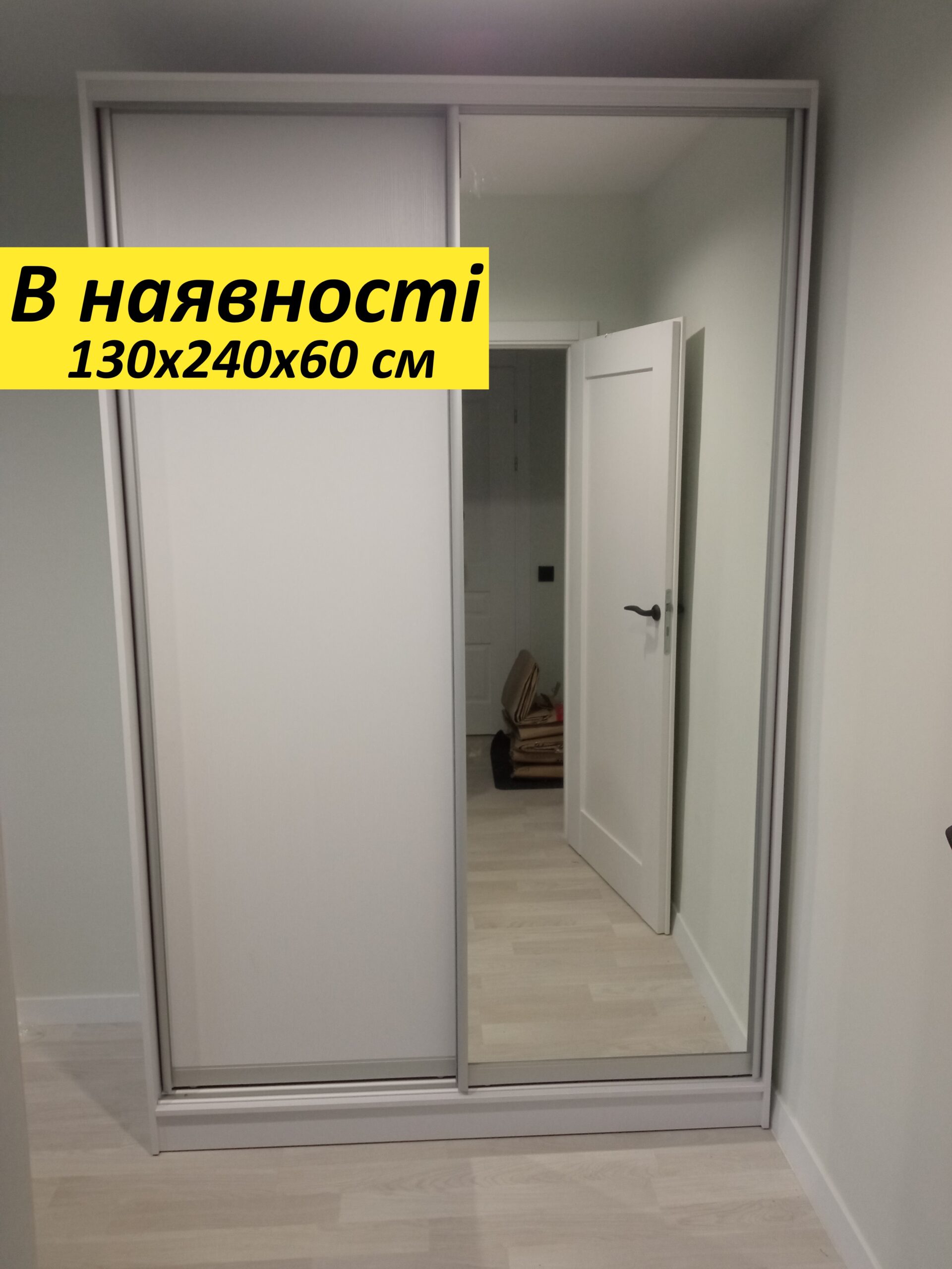 Ціна вказана за шафу розміром 130х240х60 см, де один фасад дзеркальний, другий ДСП. Також є можливість виготовити шафу купе на любий потрібний розмір, колір ДСП, колір розсувної системи, тип фасадів та вид наповнення.